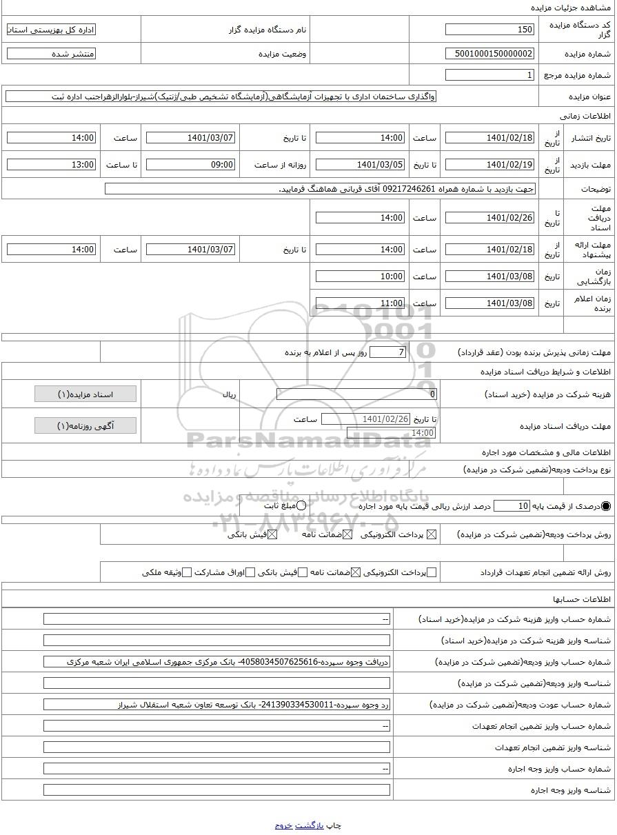 | عنوان مزایده | واگذاری ساختمان اداری با تجهیزات آزمایشگاهی(آزمایشگاه تشخیص طبی/ژنتیک)شیراز-بلوارالزهراجنب اداره ثبت | |||