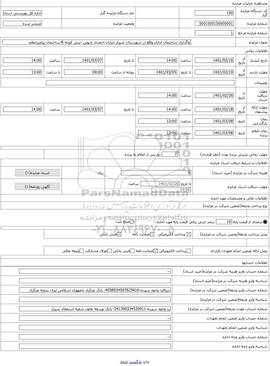 | عنوان مزایده | واگذاری ساختمان اداری واقع در شهرستان شیراز خیابان احمدی جنوبی -نبش کوچه 8-ساختمان پیامبراعظم | |||