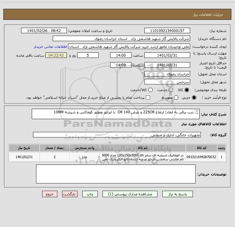 نام دستگاه خریدار:شرکت پالایش گاز شهید هاشمی نژاد استان خراسان رضوی