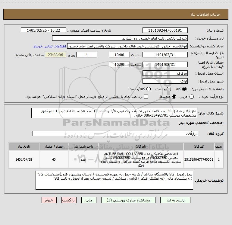 شرح کلی نیاز: نیاز 2قلم شامل 30 عدد قلم ناخنی تخلیه جهت تیوپ 3/4 و تعداد 10 عدد ناخنی تخلیه تیوب 1 اینچ طبق مشخصات پیوست 33492701-086 خانی