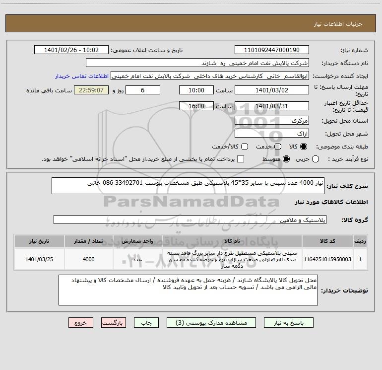 شرح کلی نیاز: نیاز 4000 عدد سینی با سایز 35*45 پلاستیکی طبق مشخصات پیوست 33492701-086 خانی