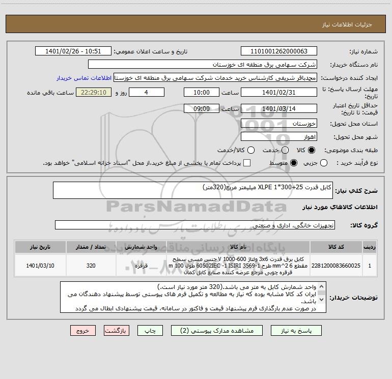 شرح کلی نیاز: کابل قدرت 25+300*1 XLPE میلیمتر مربع(320متر)