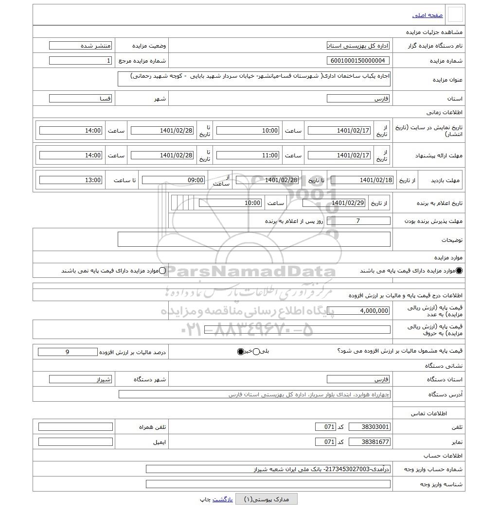 | عنوان مزایده | اجاره یکباب ساختمان اداری( شهرستان فسا-میانشهر- خیابان سردار شهید بابایی - کوچه شهید رحمانی) | |||