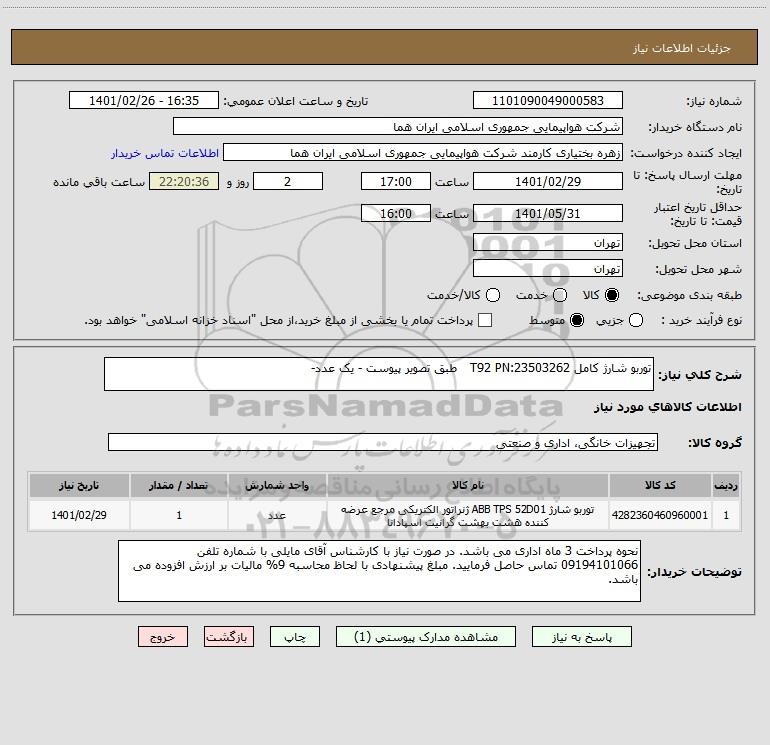 شرح کلی نیاز: توربو شارژ کامل T92 PN:23503262 طبق تصویر پیوست - یک عدد-