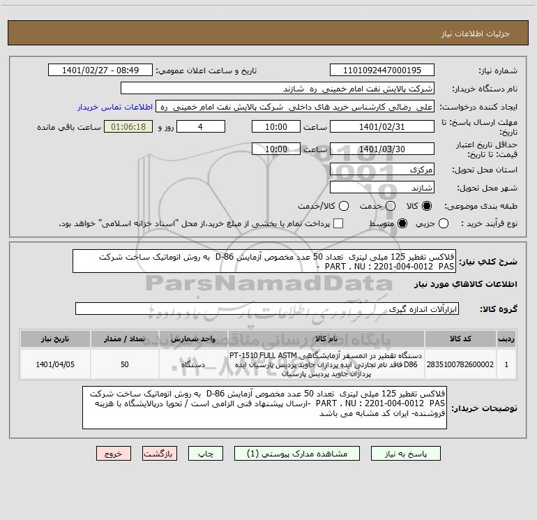 شرح کلی نیاز: فلاکس تقطیر 125 میلی لیتری تعداد 50 عدد مخصوص آزمایش D-86 به روش اتوماتیک ساخت شرکت PART . NU : 2201-004-0012 PAS -