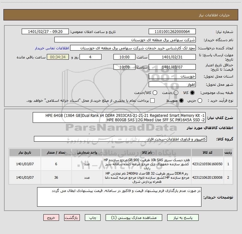استعلام 1- HPE 64GB (1X64 GB)Dual Rank x4 DDR4 2933CAS-21-21-21 Registered Smart Memory Kit 2- HPE 800GB SAS 12G Mixed Use SFF SC PM1645A SSD, استعلام 1- HPE 64GB (1X64 GB)Dual Rank x4 DDR4 2933CAS-21-21-21 Registered Smart Memory Kit 2- HPE 800GB SAS 12G Mixed Use SFF SC PM1645A SSD