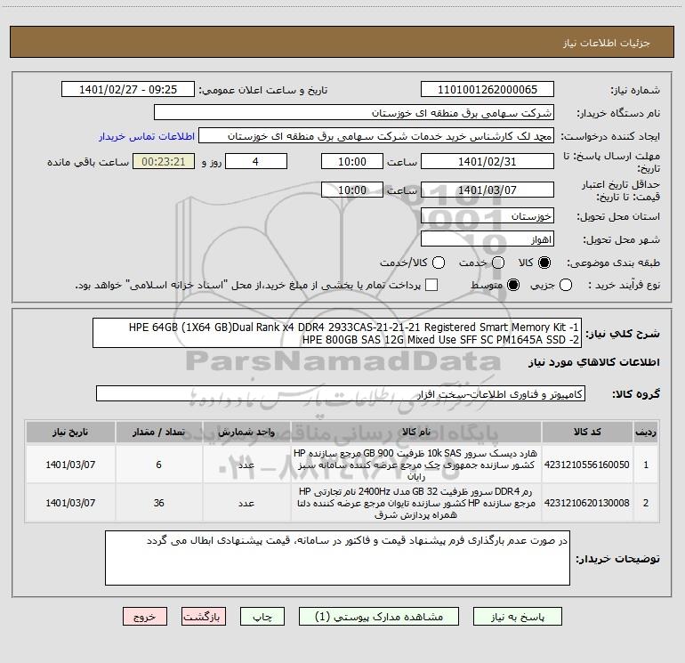 شرح کلی نیاز: 1- HPE 64GB (1X64 GB)Dual Rank x4 DDR4 2933CAS-21-21-21 Registered Smart Memory Kit