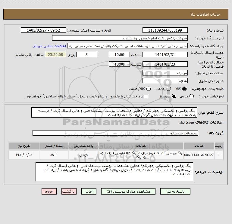 توضیحات خریدار: رنگ روغنی و پلاستیکی چهارقلم/ مطابق مشخصات پیوست پیشنهاد فنی و مالی ارسال گردد / دربسته بندی مناسب /پالت شده باشد / تحویل درپالایشگاه با هزینه فروشنده می باشد / ایران کد مشابه است