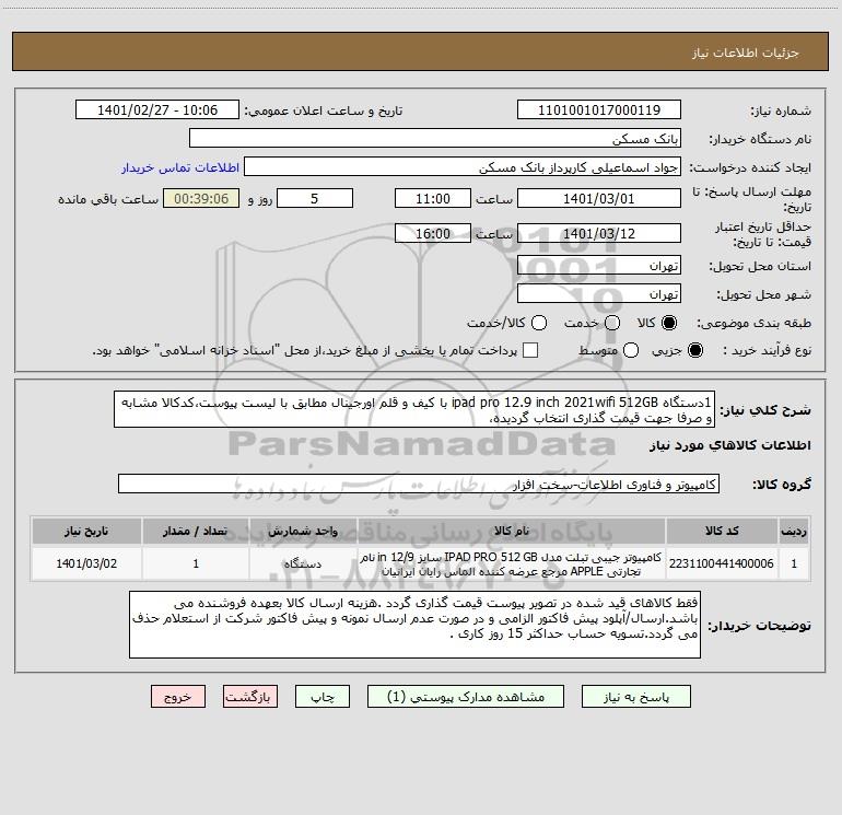 شرح کلی نیاز: 1دستگاه ipad pro 12.9 inch 2021wifi 512GB با کیف و قلم اورجینال مطابق با لیست پیوست،کدکالا مشابه و صرفا جهت قیمت گذاری انتخاب گردیده،