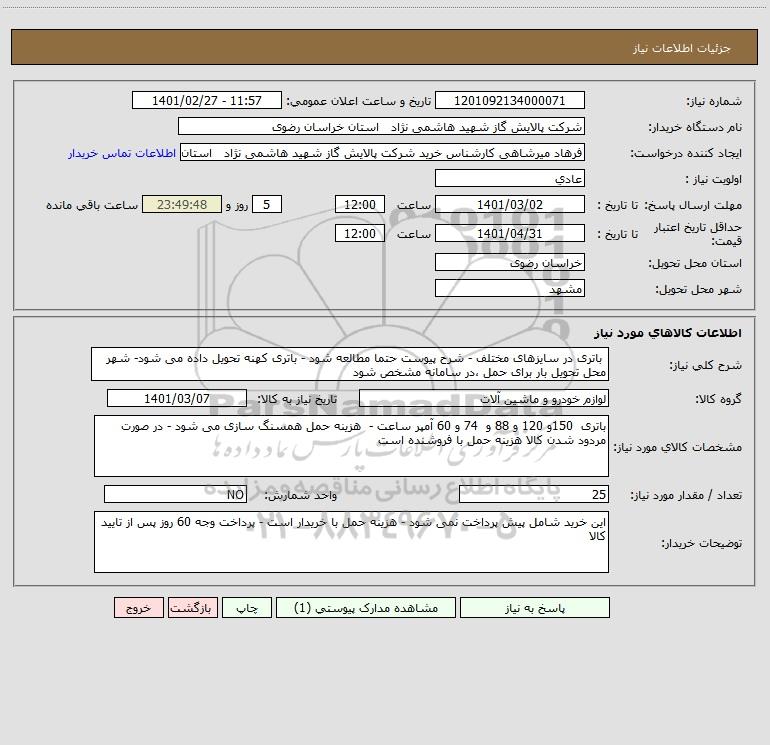 نام دستگاه خریدار:شرکت پالایش گاز شهید هاشمی نژاد استان خراسان رضوی