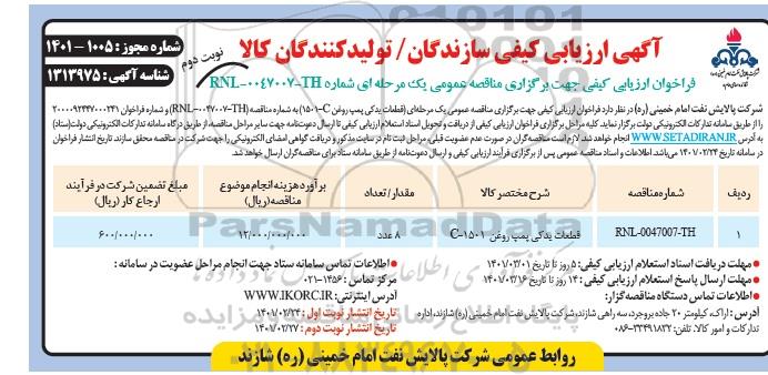 فراخوان ارزیابی کیفی جهت برگزاری مناقصه عمومی یک مرحله ای شماره RNL-0047007-TH