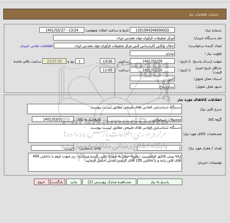 مشخصات کالای مورد نیاز: دستگاه شناسایی الماس های طبیعی مطابق لیست پیوست