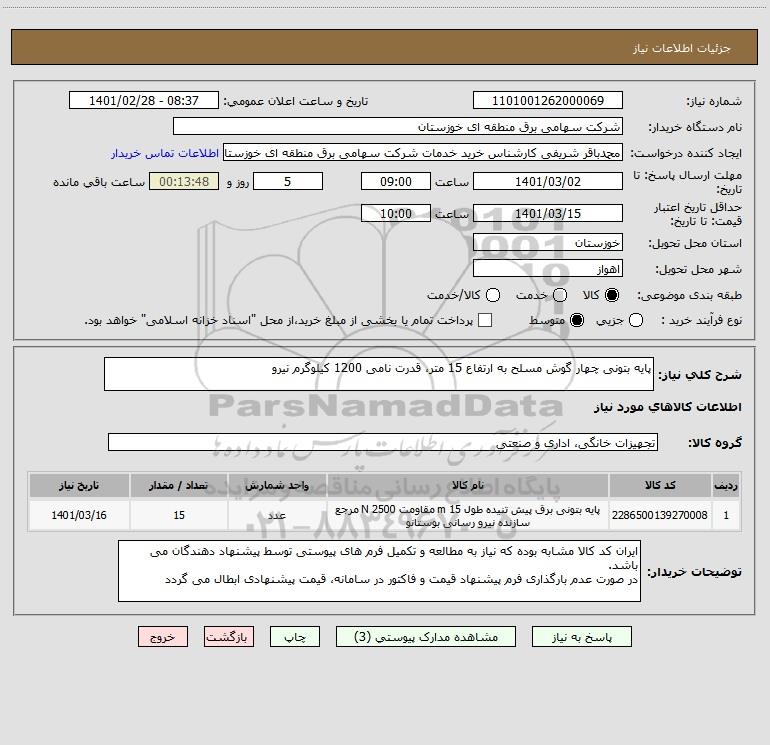 شرح کلی نیاز: پایه بتونی چهار گوش مسلح به ارتفاع 15 متر، قدرت نامی 1200 کیلوگرم نیرو