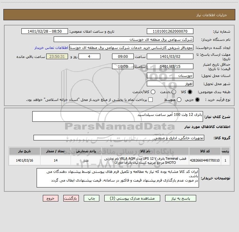 شرح کلی نیاز: باتری 12 ولت 100 آمپر ساعت سیلداسید