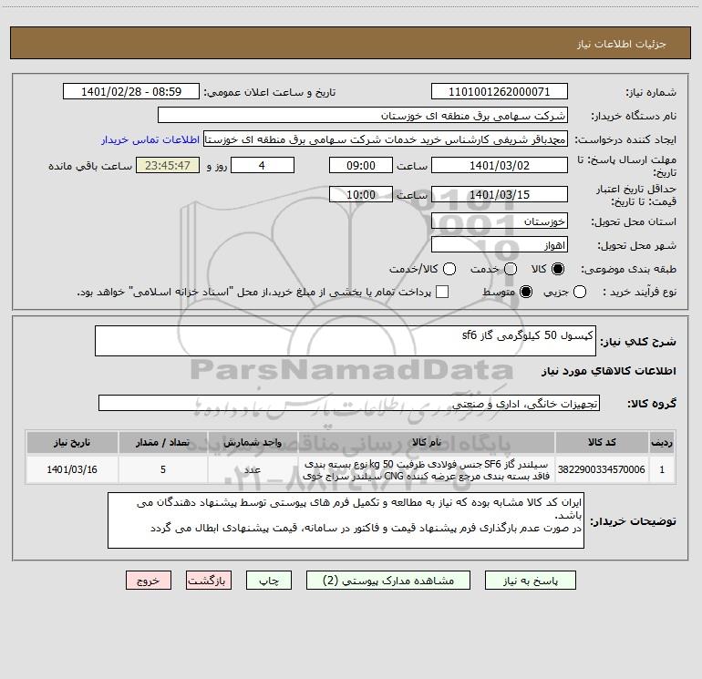 شرح کلی نیاز: کپسول 50 کیلوگرمی گاز sf6