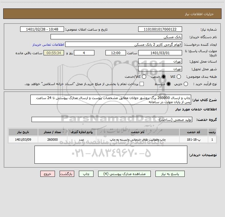 شرح کلی نیاز: چاپ و ارسال 260000 برگ بروشور جوانان مطابق مشخصات پیوست و ارسال مدارک پیوستی تا 24 ساعت پس از پایان مهلت در سامانه