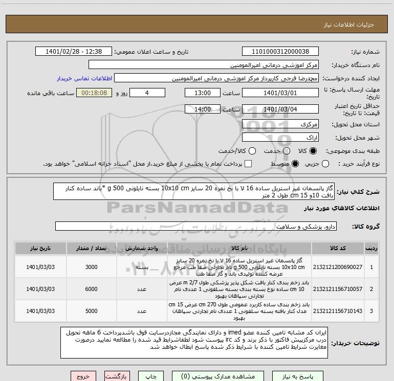 | 2 | 2132121156710057 | باند زخم بندی کنار بافت شکل پذیر پزشکی طول 2/7 m عرض 10 cm ساده نوع بسته بندی بسته سلفونی 1 عددی نام تجارتی سپاهان بهبود | عدد | 6000 | 1401/03/03 |