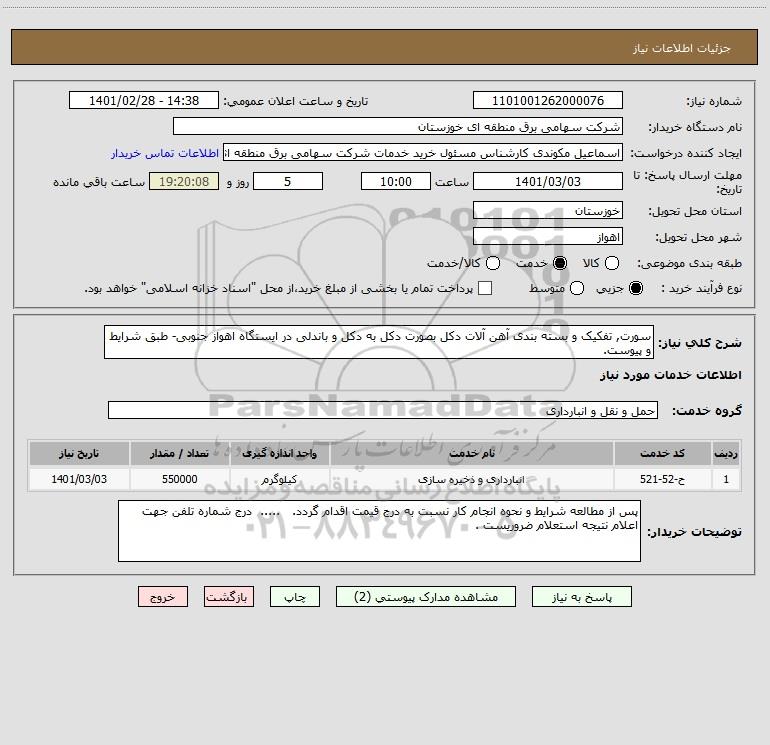 شرح کلی نیاز: سورت, تفکیک و بسته بندی آهن آلات دکل بصورت دکل به دکل و باندلی در ایستگاه اهواز جنوبی- طبق شرایط و پیوست.