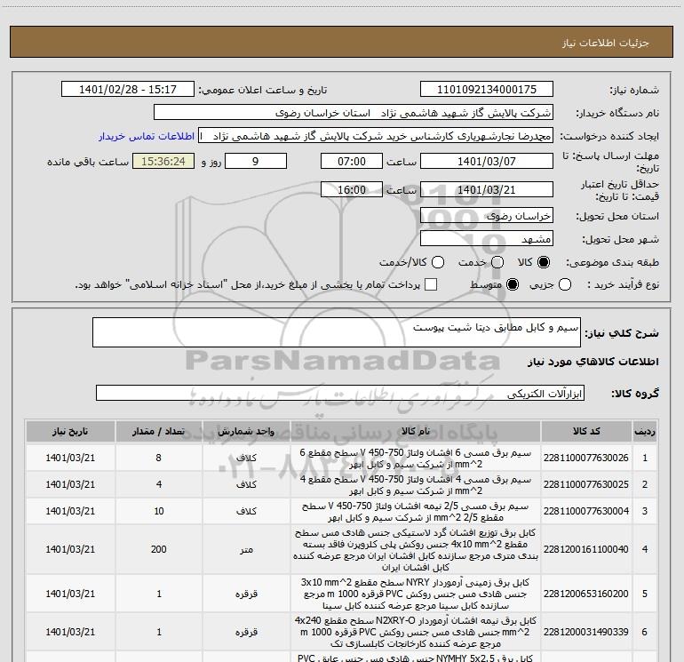 شرح کلی نیاز: سیم و کابل مطابق دیتا شیت پیوست