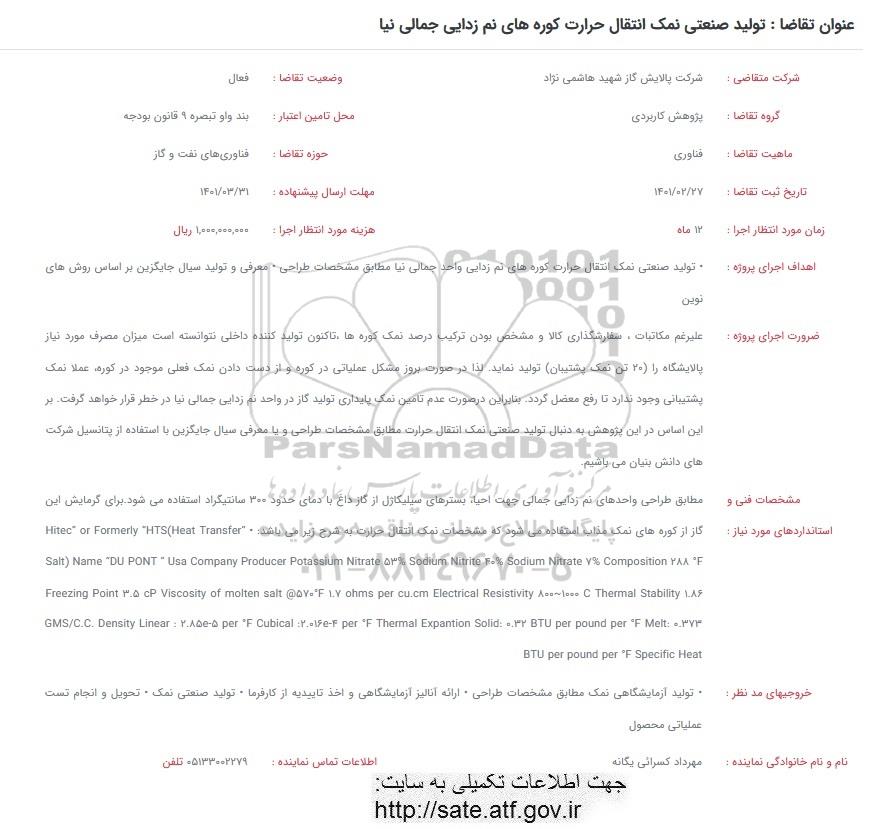 فراخوان تولید صنعتی نمک انتقال حرارت کوره های نم زدایی جمالی نیا , فراخوان، فراخوان تولید صنعتی نمک انتقال حرارت کوره های نم زدایی جمالی نیا