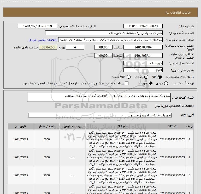 شرح کلی نیاز: پیچ و یک مهره و دو واشر تخت و یک واشر فنری گالوانیزه گرم با سایزهای مختلف