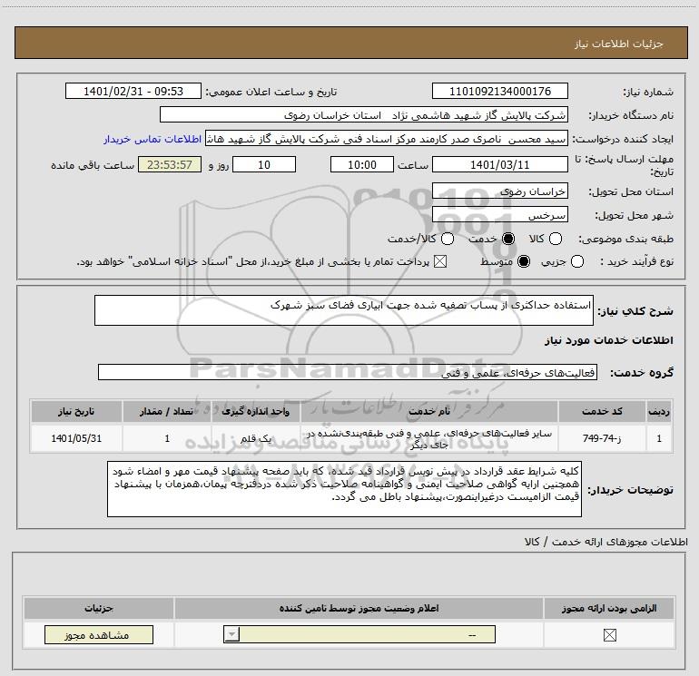 نام دستگاه خریدار:شرکت پالایش گاز شهید هاشمی نژاد استان خراسان رضوی