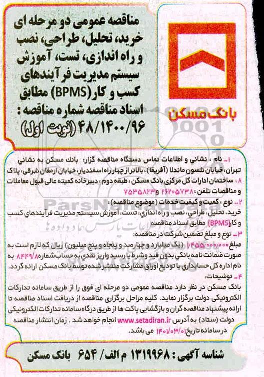 مناقصه عمومی دومرحله ای خرید ، تحلیل ، طراحی ، نصب و راه اندازی ، تست ، آموزش سیستم مدیریت فرآیندهای کسب وکار bpms مطابق اسناد مناقصه شماره مناقصه 48.1400/96 نوبت اول