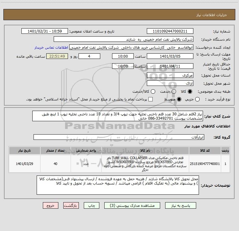 شرح کلی نیاز: نیاز 2قلم شامل 30 عدد قلم ناخنی تخلیه جهت تیوپ 3/4 و تعداد 10 عدد ناخنی تخلیه تیوب 1 اینچ طبق مشخصات پیوست 33492701-086 خانی