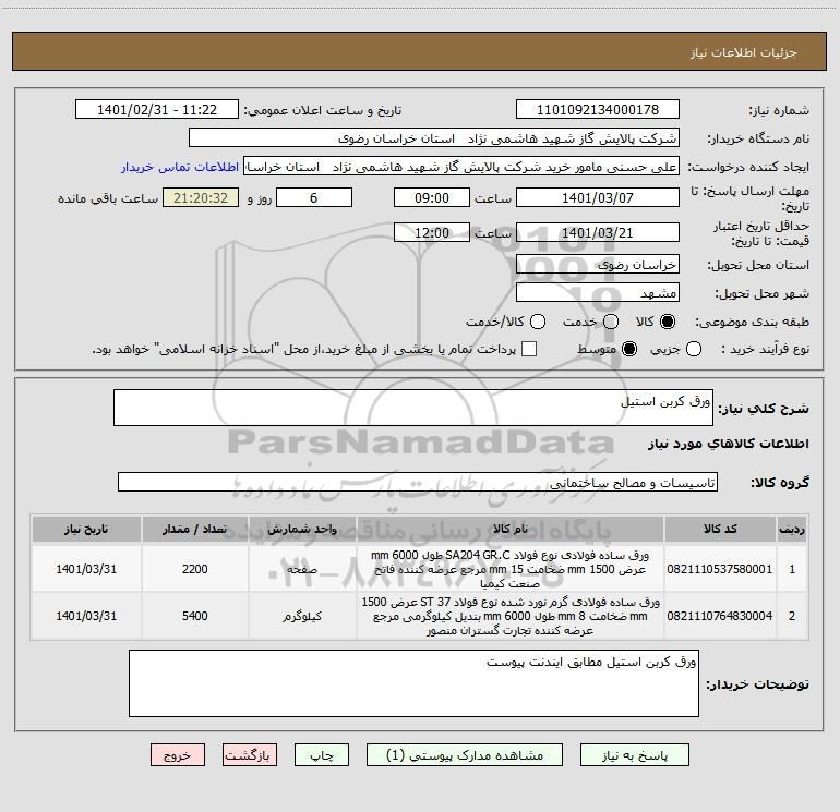 نام دستگاه خریدار:شرکت پالایش گاز شهید هاشمی نژاد استان خراسان رضوی