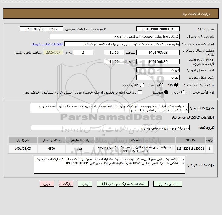 شرح کلی نیاز: جلد پلاستیک طبق نمونه پیوست - ایران کد جهت تشابه است - نحوه پرداخت سه ماه اداری است جهت هماهنگی با کارشناس تماس گرفته شود .