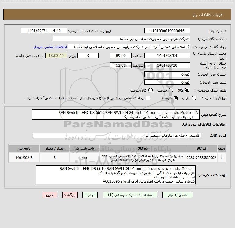 | 1 | 2233120333830002 | سوئیچ دیتا شبکه رایانه مدل SAN-SWITCH نام تجارتی EMC مرجع عرضه کننده پردازش موازی داده ها پارس | عدد | 3 | 1401/03/18 |