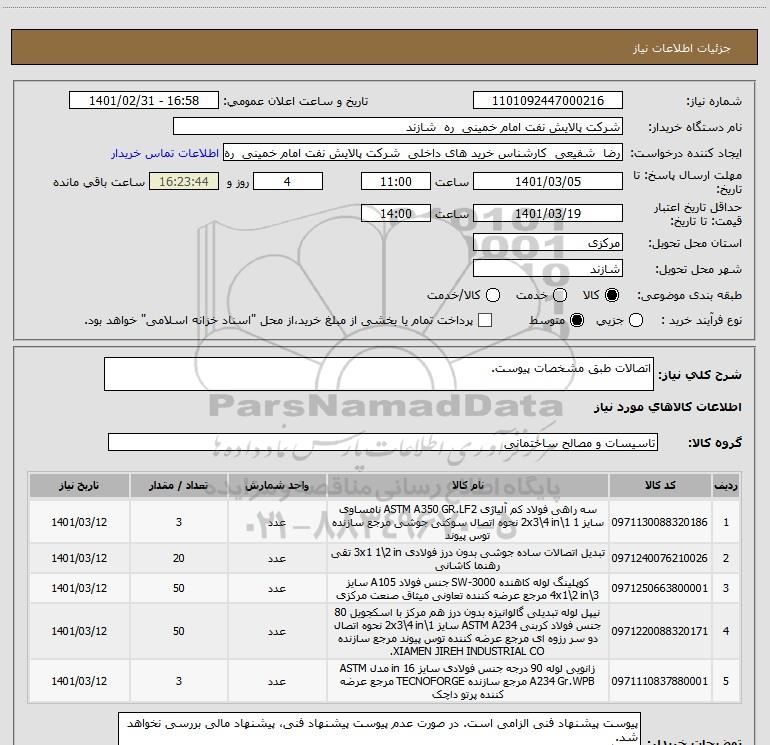 شرح کلی نیاز: اتصالات طبق مشخصات پیوست.