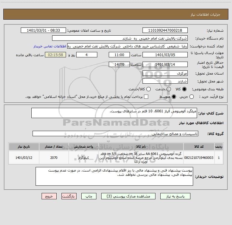 شرح کلی نیاز: میلگرد آلومینومی آلیاژ 6061، 10 قلم در سایزهای پیوست.