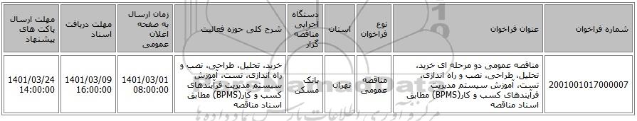 2001001017000007مناقصه عمومی دو مرحله ای خرید، تحلیل، طراحی، نصب و راه اندازی، تست، آموزش سیستم مدیریت فرآیندهای کسب و کار(BPMS) مطابق اسناد مناقصه مناقصه عمومیتهرانبانک مسکنخرید، تحلیل، طراحی، نصب و راه اندازی، تست، آموزش سیستم مدیریت فرآیندهای کسب و کار(BPMS) مطابق اسناد مناقصه 1401/03/01 08:00:001401/03/09 16:00:001401/03/24 14:00:00