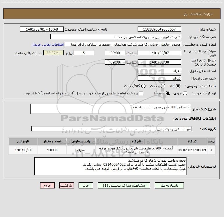 شرح کلی نیاز: آبمعدنی 200 سی سی 400000 عدد