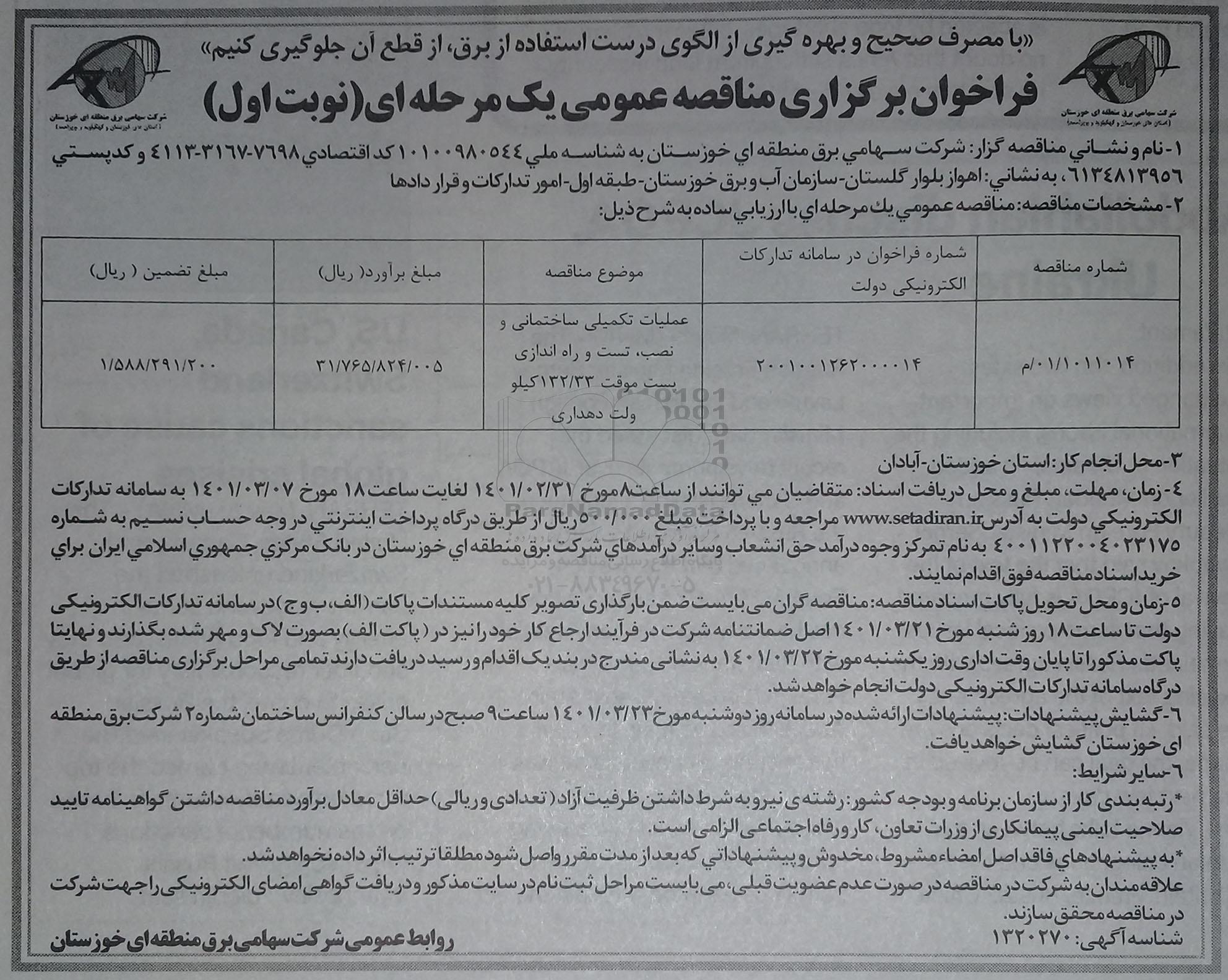 1- نام و نشانی مناقصه گزار: شرکت سهامی برق منطقه ای خوزستان به شناسه ملی 10100980544 کداقتصادی 4113-3167-7698 و کدپستی 6134813956 به نشانی اهواز بلوار گلستان سازمان آب و برق خوزستان طبه اول امور تدارکات و قراردادها