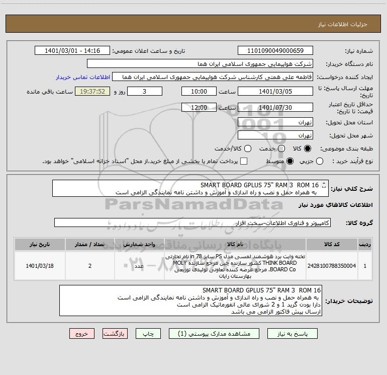 شرح کلی نیاز: SMART BOARD GPLUS 75" RAM 3 ROM 16