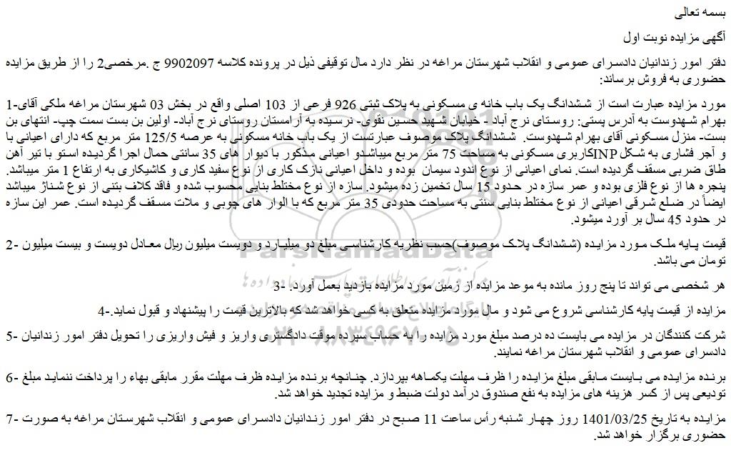1-مورد مزایده عبارت است از ششدانگ یک باب خانه ی مسکونی به پلاک ثبتی 926 فرعی از 103 اصلی واقع در بخش 03 شهرستان مراغه ملکی آقای بهرام شهدوست به آدرس پستی: روستای نرج آباد - خیابان شهید حسین نقوی- نرسیده به آرامستان روستای نرج آباد- اولین بن بست سمت چپ- انتهای بن بست- منزل مسکونی آقای بهرام شهدوست.  ششدانگ پلاک موصوف عبارتست از یک باب خانه مسکونی به عرصه 125/5 متر مربع که دارای اعیانی با کاربری مسکونی به مساحت 75 متر مربع میباشدو اعیانی مذکور با دیوار های 35 سانتی حمال اجرا گردیده استو با تیر آهنINP و آجر فشاری به شکل طاق ضربی مسقف گردیده است. نمای اعیانی از نوع اندود سیمان  بوده و داخل اعیانی نازک کاری از نوع سفید کاری و کاشیکاری به ارتفاع 1 متر میباشد. پنجره ها از نوع فلزی بوده و عمر سازه در حدود 15 سال تخمین زده میشود. سازه از نوع مختلط بنایی محسوب شده و فاقد کلاف بتنی از نوع شناژ میباشد ایضاً در ضلع شرقی اعیانی از نوع مختلط بنایی سنتی به مساحت حدودی 35 متر مربع که با الوار های چوبی و ملات مسقف گردیده است. عمر این سازه در حدود 45 سال بر آورد میشود.