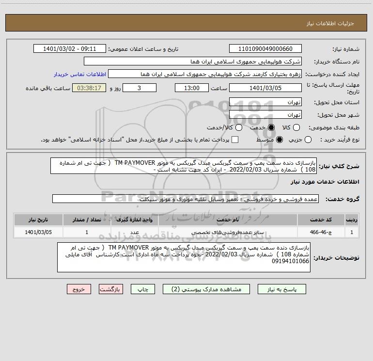 توضیحات خریدار:بازسازی دنده سمت پمپ و سمت گیربکس مبدل گیربکس به موتور TM PAYMOVER ( جهت تی ام شماره 108 ) شماره سریال 2022/02/03 -نحوه پرداخت سه ماه اداری است کارشناس آقای مایلی 09194101066