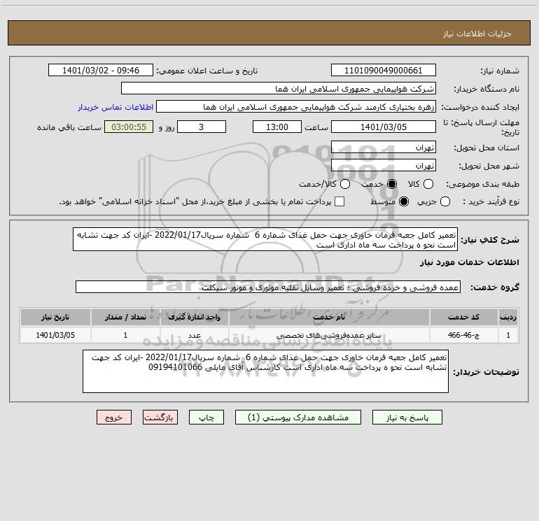 شرح کلی نیاز: تعمیر کامل جعبه فرمان خاوری جهت حمل غذای شماره 6 شماره سریال2022/01/17 -ایران کد جهت تشابه است نحو ه پرداخت سه ماه اداری است