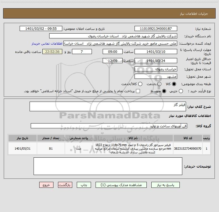 نام دستگاه خریدار:شرکت پالایش گاز شهید هاشمی نژاد استان خراسان رضوی