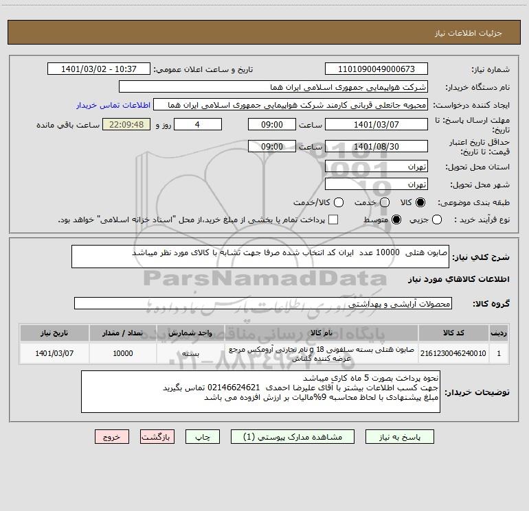 شرح کلی نیاز: صابون هتلی 10000 عدد ایران کد انتخاب شده صرفا جهت تشابه با کالای مورد نظر میباشد