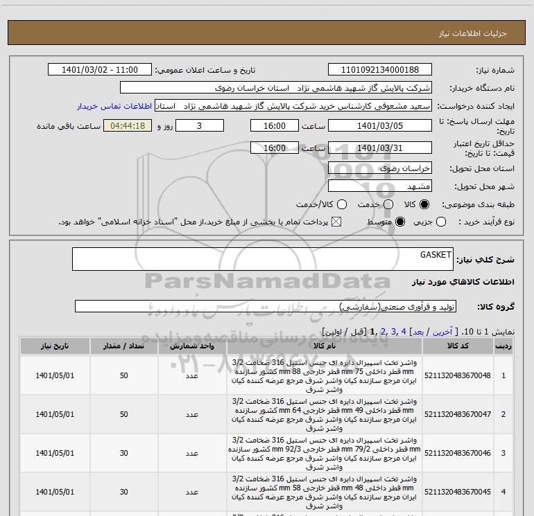 نام دستگاه خریدار:شرکت پالایش گاز شهید هاشمی نژاد استان خراسان رضوی