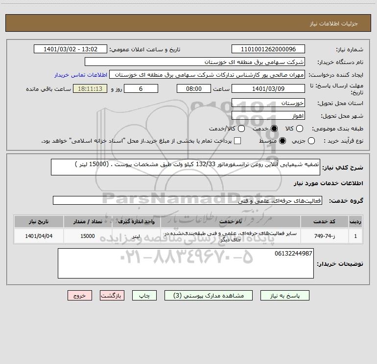 شرح کلی نیاز: تصفیه شیمیایی آنلاین روغن ترانسفورماتور 132/33 کیلو ولت طبق مشخصات پیوست . (15000 لیتر )