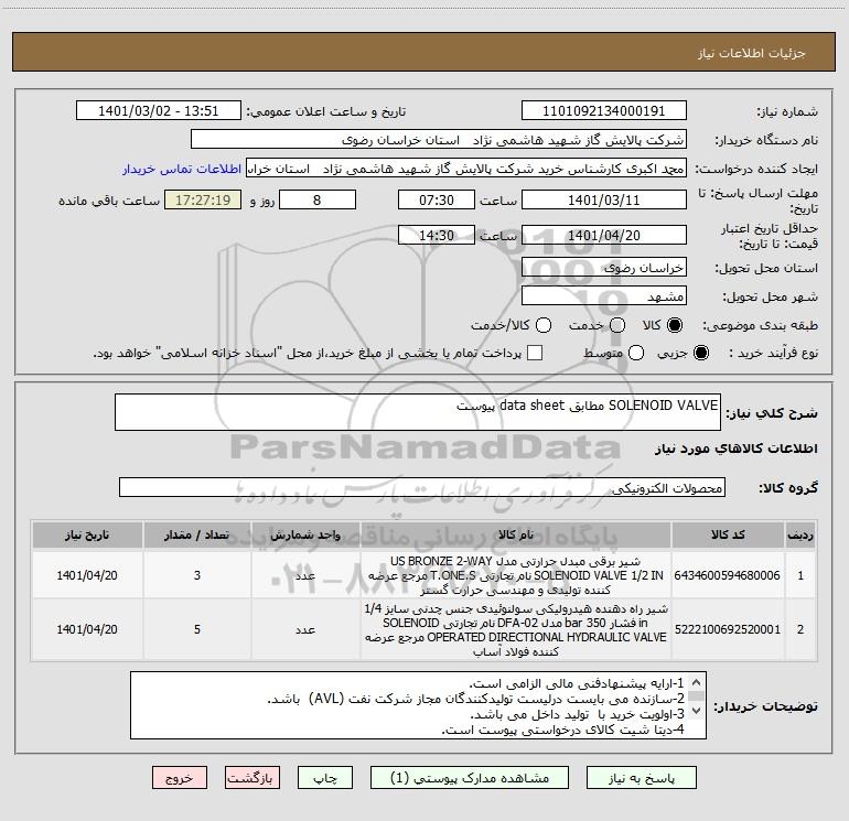 شرح کلی نیاز: SOLENOID VALVE مطابق data sheet پیوست