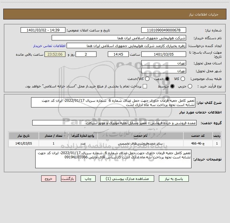 شرح کلی نیاز: تعمیر کامل جعبه فرمان خاوری جهت حمل غذای شماره 6 شماره سریال 2022/01/17- ایران کد جهت تشابه است نحوه پرداخت سه ماه اداری است