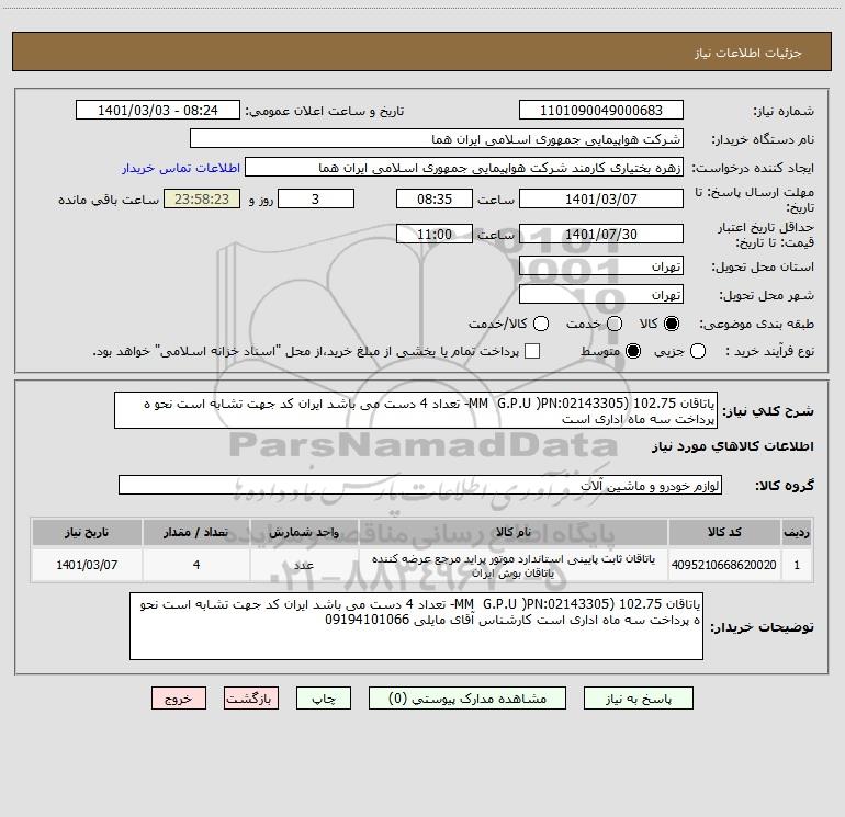 استعلام یاتاقان 102.75 (MM G.P.U )PN:02143305- تعداد 4 دست می باشد ایران کد جهت تشابه است نحو ه پرداخت سه ماه اداری است , استعلام یاتاقان 102.75 (MM G.P.U )PN:02143305- تعداد 4 دست می باشد ایران کد جهت تشابه است نحو ه پرداخت سه ماه اداری است