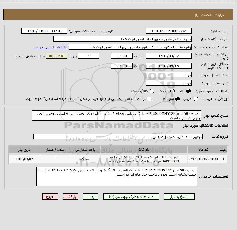 شرح کلی نیاز: تلویزیون 50 اینچ GPLUS50MH512N- با کارشناس هماهنگ شود آ- ایران کد جهت تشابه است نحوه پرداخت چهارماه اداری است