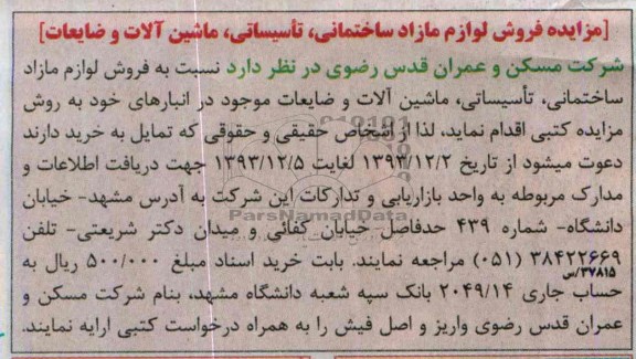 شرکت مسکن و عمران قدس رضوی در نظر دارد نسبت به فروش لوازم مازاد ساختمانی ، تاسیساتی ، ماشین آلات و ضایعات موجود در انبارهای خود به روش مزایده کتبی اقدام نماید .