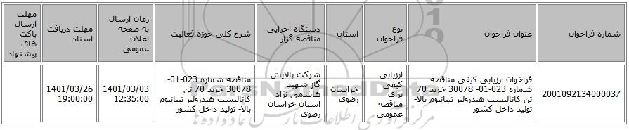 | 2001092134000037 | فراخوان ارزیابی کیفی مناقصه شماره 023-01- 30078 خرید 70 تن کاتالیست هیدرولیز تیتانیوم بالا- تولید داخل کشور | ارزیابی کیفی برای مناقصه عمومی | خراسان رضوی | شرکت پالایش گاز شهید هاشمی نژاد استان خراسان رضوی | مناقصه شماره 023-01- 30078 خرید 70 تن کاتالیست هیدرولیز تیتانیوم بالا- تولید داخل کشور | 1401/03/03 12:35:00 | 1401/03/26 19:00:00 |